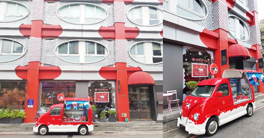 還沒進門就被紅盒牛牛車吸引過去! 紅白相間的配色相當醒目,