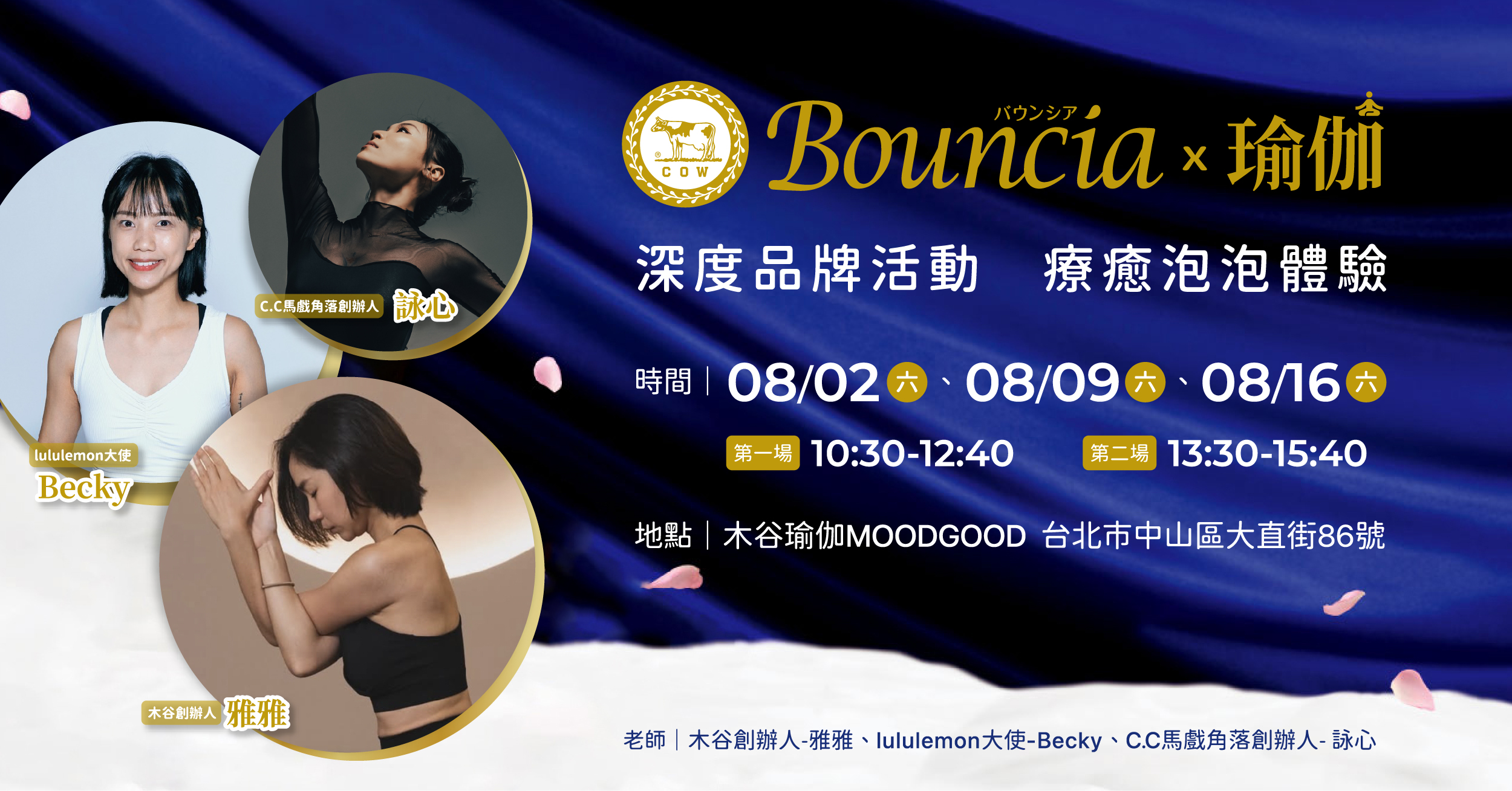 牛乳石鹼今年夏天攜手複合式瑜珈空間「木谷 MOOD GOOD」,於 8/2、8/9、8/16 連續三個週六舉辦「Bouncia自慢肌 × 瑜伽|深度品牌體驗日」,以「自信・慢活・愛自己」為主題,打造融合身心療癒、香氛泡泡與瑜伽伸展的夏日儀式,邀請妳一同在城市節奏中練習回到自己。